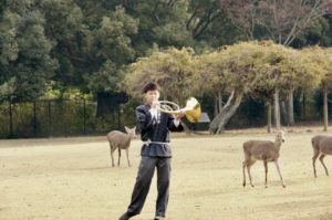 10時から春日大社境内「飛火野」で行われ、ナチュラルホルンの音を合図に多くの鹿が飛火野にやってきます。